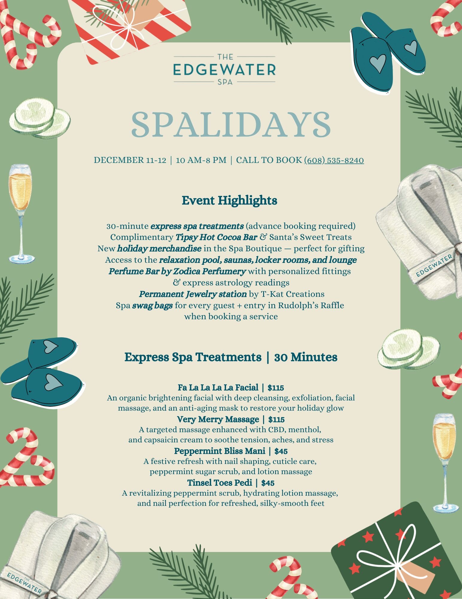 - Spa swag bags for every guest + entry in Rudolph’s Raffle when booking a service